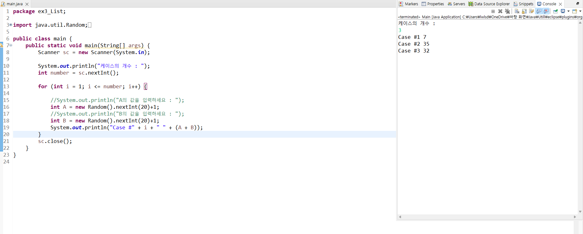 System.out.println("Case #" + number + " " + (A + B)); 에 i가 아닌 number를 넣어