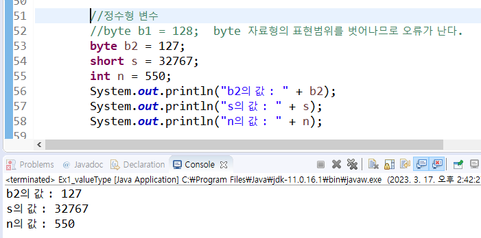 byte b1 = 128;  byte 자료형의 표현범위를 벗어나므로 오류가 난다.