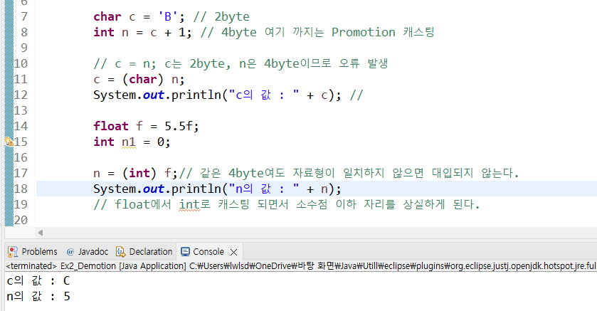 -Demotion : 큰 자료형을 작은 자료형에다 대입하는것(강제 형변환, 명시적 형변환)